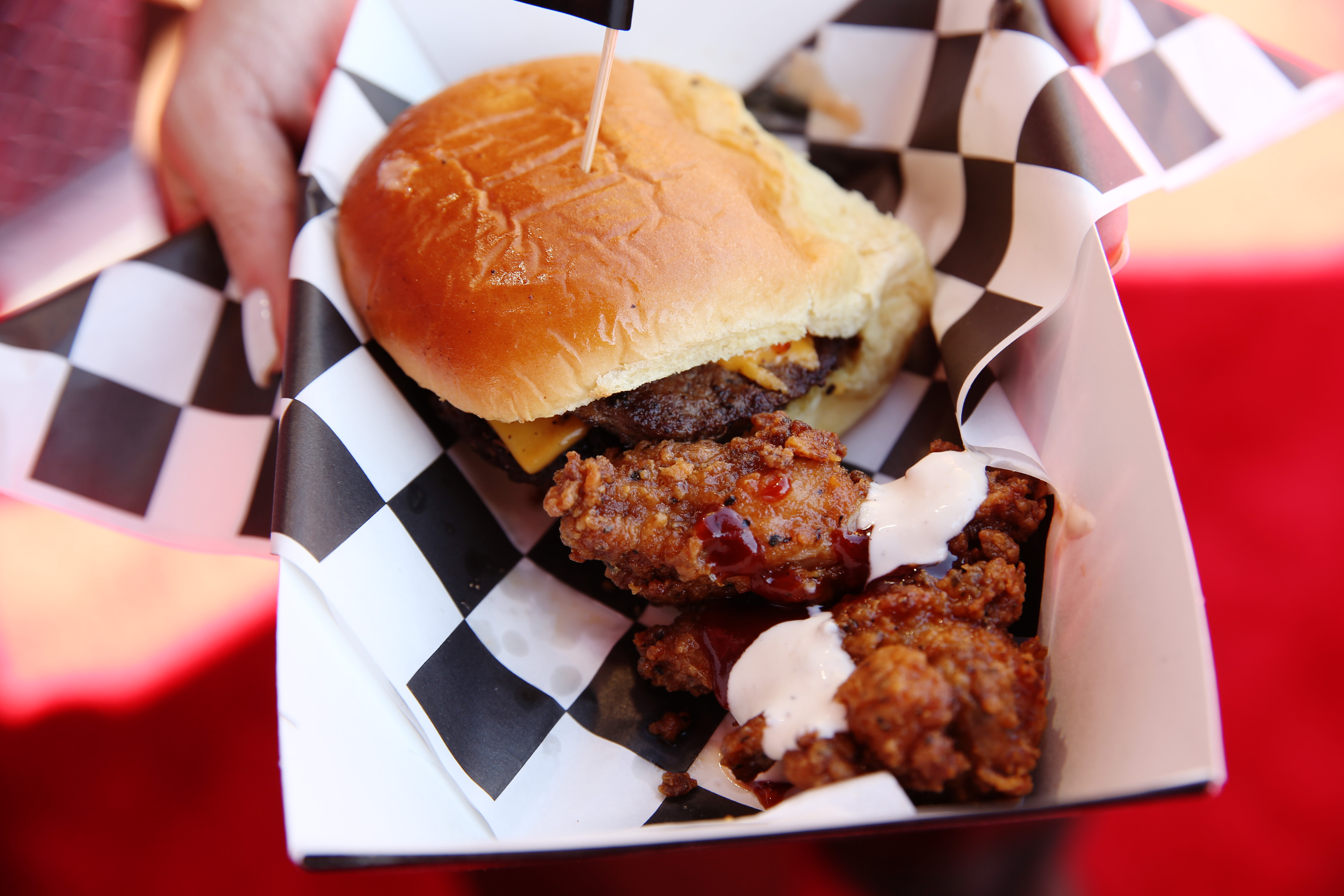 • White Truffle ‘Shroom Burger: Crisp-fried Portobello mushroom filled with melted muenster and cheddar cheeses, white truffle sauce, shredded lettuce on a toasted potato bun (starts at $8.99)